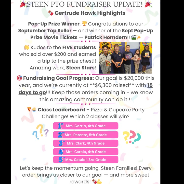 🚨 Steen PTO Fundraiser Update! 🚨 Congrats to our Top Seller & Pop-Up Prize Winner, Patrick Horndern! 🎉👏 5 students sold $200+ & hit the prize chest! 🌟 We’ve raised $6,300 with 15 days to go—let’s keep it up, Steen Stars! 🍕🧁 Who will win the class party? 💪🍫 @bogotapublic