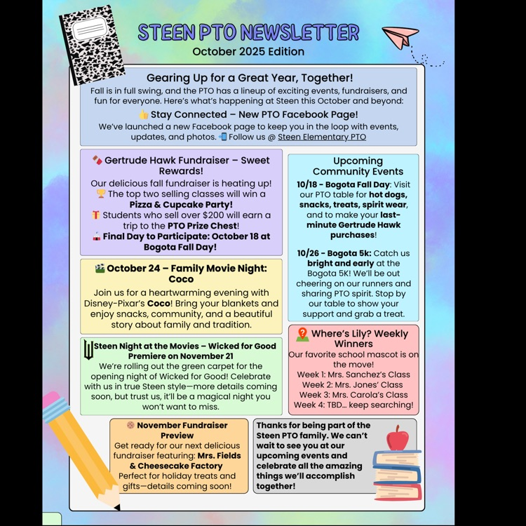 🎃 The Steen PTO is gearing up for a great year! Don’t miss fall fun like the Gertrude Hawk fundraiser, Family Movie Night 🎬 Coco on Oct. 24, and Steen Night at the Movies on Nov. 21! 🍫✨ Follow for updates + sweet rewards! @bogotapublic