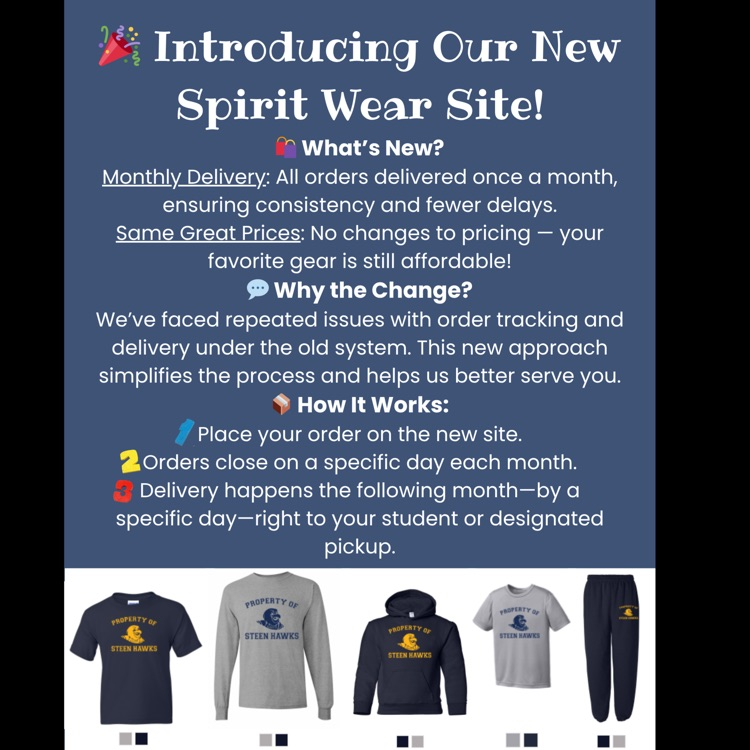 🎉 Introducing our NEW Spirit Wear Site! 🦅 Same great prices, now with monthly delivery for fewer delays and smoother ordering. Show your Steen pride and shop today: https://www.scholasticimpressions.com/steen-elementary @bogotapublic