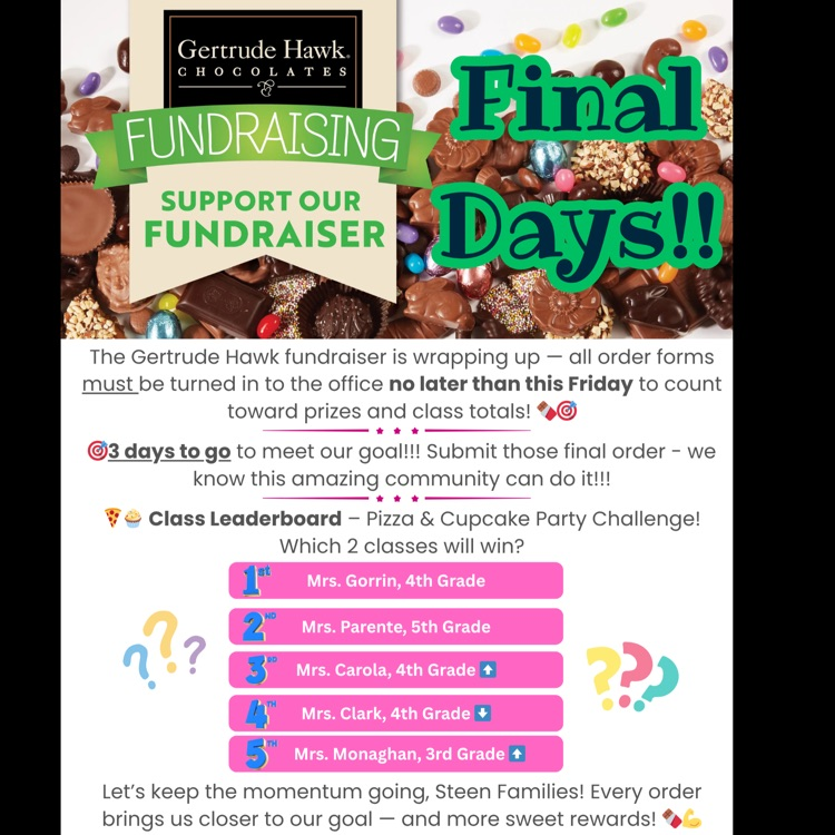 The Gertrude Hawk fundraiser is wrapping up! 🍫 Turn in all order forms to the office by Friday. 🎯 Class Pizza & Cupcake Party winners announced next week! Still need to order? Stop by the Steen PTO table at Bogota Fall Fest Sat 11–2pm! Let’s finish strong! 💪 @bogotapublic