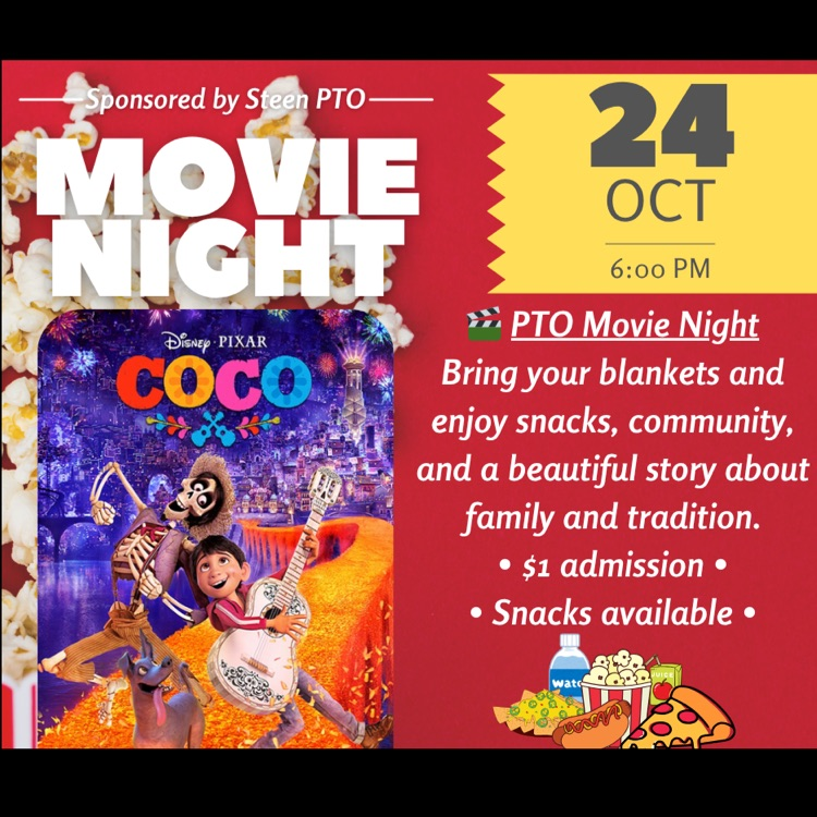 🎬Lights, blankets, action! Join us for Steen PTO’s Movie Night featuring Coco! 💀Bring a blanket, settle in, and enjoy a cozy evening of family fun, great company, and a heartwarming film. 🍿@bogotapublic