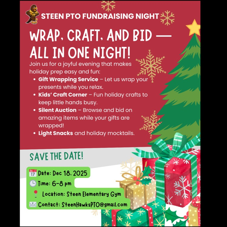 Save the date! 🎁 Steen PTO is hosting a fun holiday night on Dec 18 from 6–8 PM at Steen Elementary. Enjoy gift wrapping, a kids’ craft corner, a silent auction, and some light snacks + refreshments. Come get your holiday prep done and support the PTO! @bogotapublic