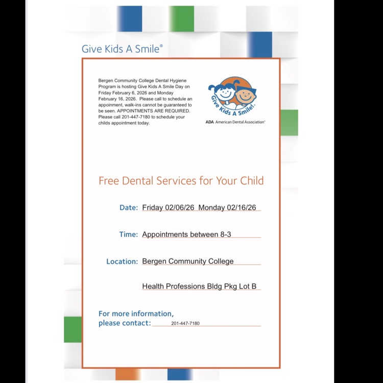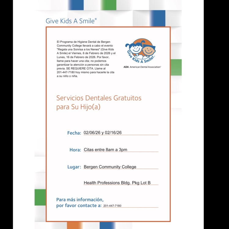 Bergen Community College Dental Hygiene Program is offering free dental services for children on Feb 6 and Feb 16, 2026 by appointment only. Appointments are available between 8:00–3:00. To schedule an appointment, please call 201-447-7180. 🦷✨ @bogotapublic