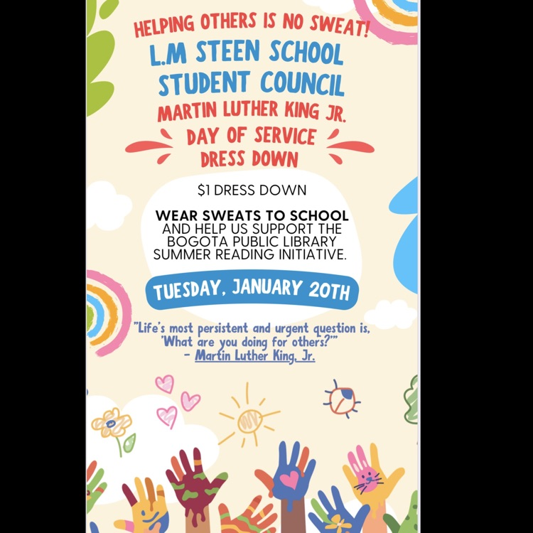 Helping others is no sweat! 💙 L.M. Steen Student Council is hosting a $1 dress down for MLK Jr. Day of Service. Wear sweats on Tuesday, Jan. 20 and support the Bogota Public Library Summer Reading Initiative. @bogotapublic